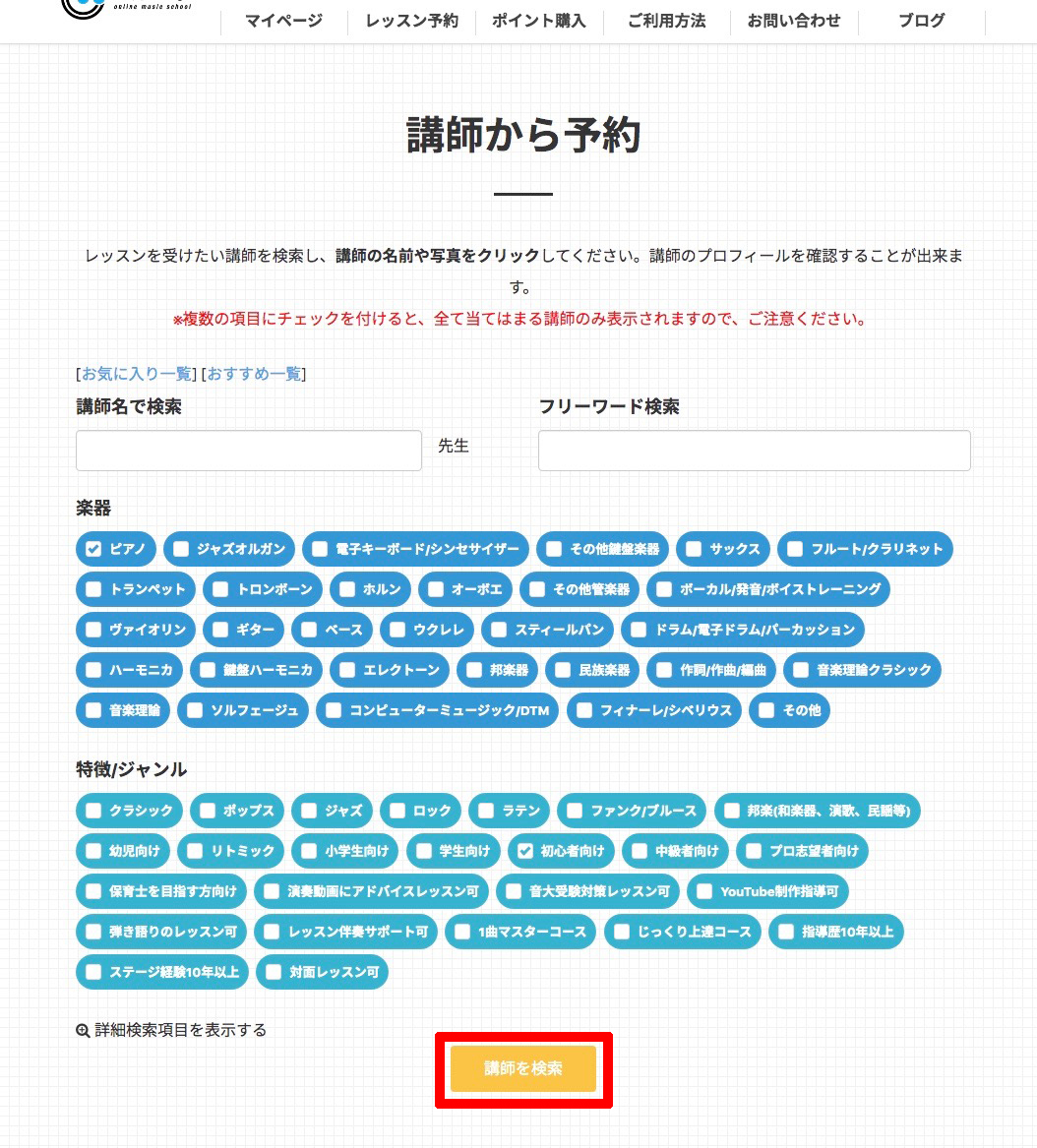 何の楽器のレッスンを受けるかをチェックすると、講師の一覧が出てきます。
