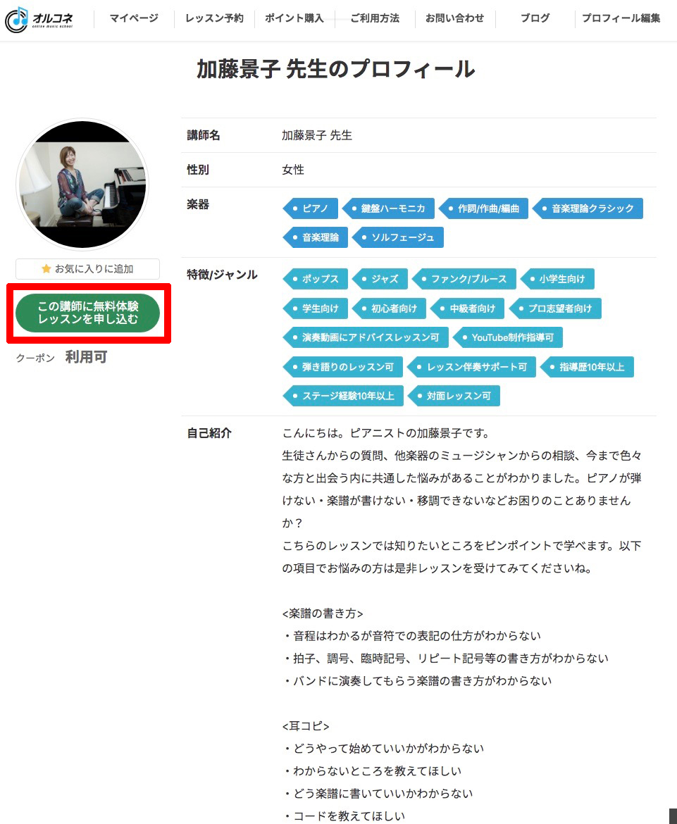 無料体験をしたい講師を選択して「無料レッスンの申し込み」をクリック