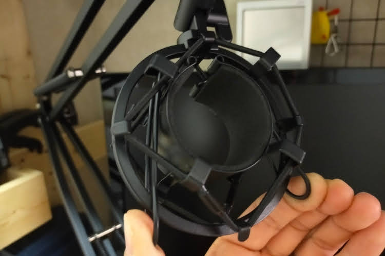 しかし、上の画像であるように、振動を吸収する為のショックマウントの、肝心なゴムが引っかかるツメの角度が緩くて、簡単に外れてしまいました。