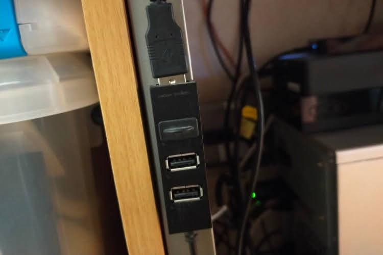 パソコンに差しているUSB端子を、その都度に抜き差しするのも狭い場所なので面倒です。