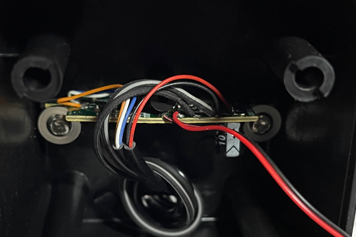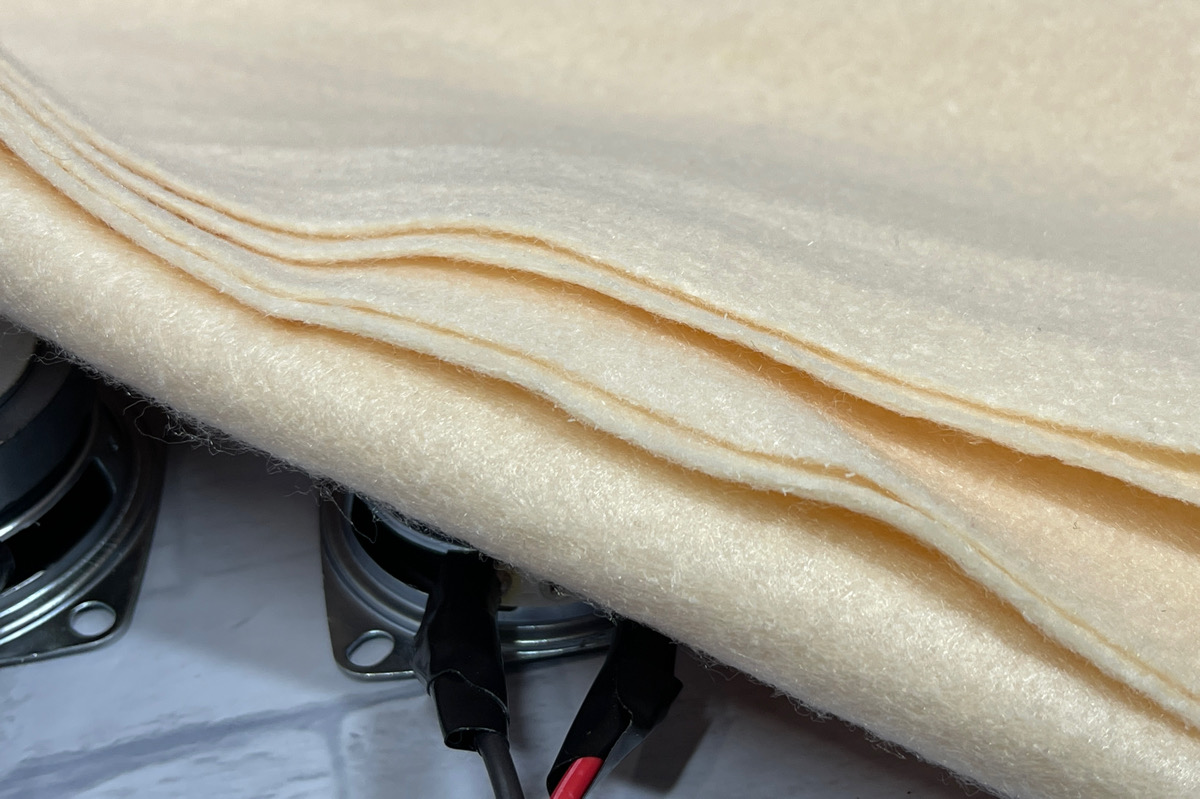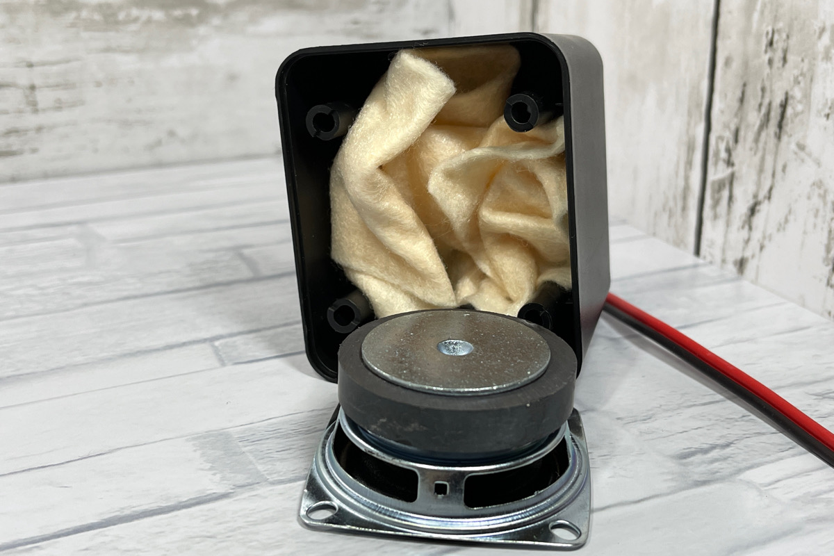 一応、スピーカーラインが引っ張られないように、軽くお団子結びをしてストッパーにしてからフェルトを適当に突っ込みます。