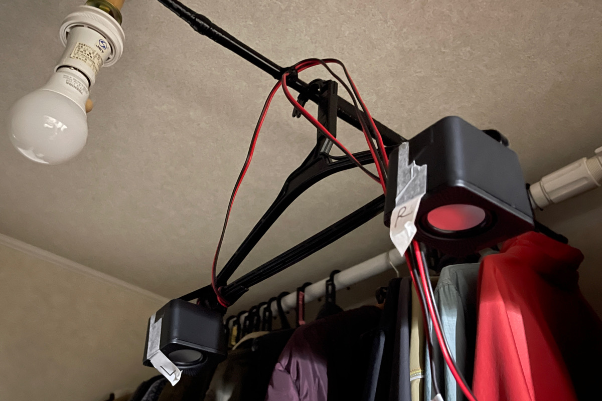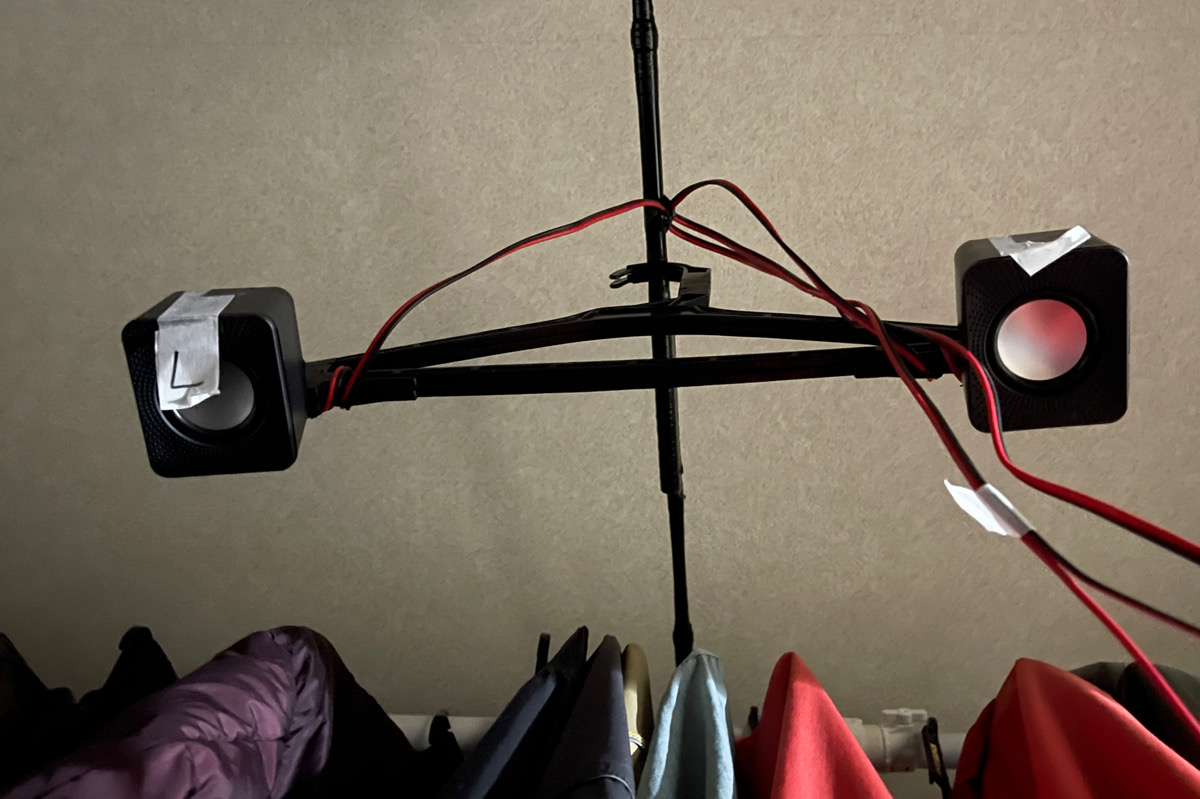 そして、ハンガーに今回の100均(330円)スピーカーを固定して、この突っ張り棒に引っ掛けて完成です!!