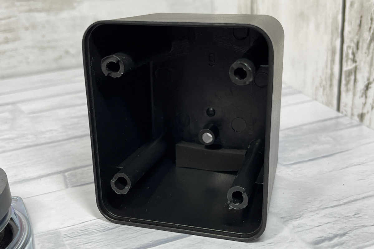 スピーカーのバッフル?銀色の4つ穴のあいた板と表面のフタとの間に何も挟まっていなかったので、ゴムシートを挟もうと思ったのですが、蓋の高さが変わってくるので止めました。