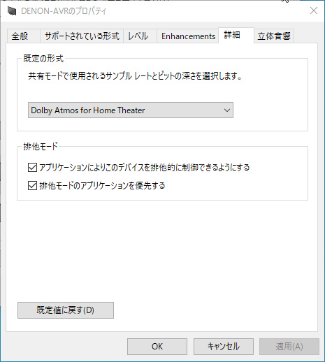 こちらも構成と同じく「Dolby Atmos for Home Theater」を選択して適用をクリックします。
