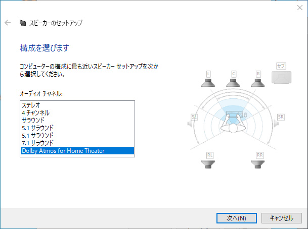 構成を選択する画面になるので、一番下の「Dolby Atmos for Home Theater」を選択して「次へ」をクリックして設定を完了させます。