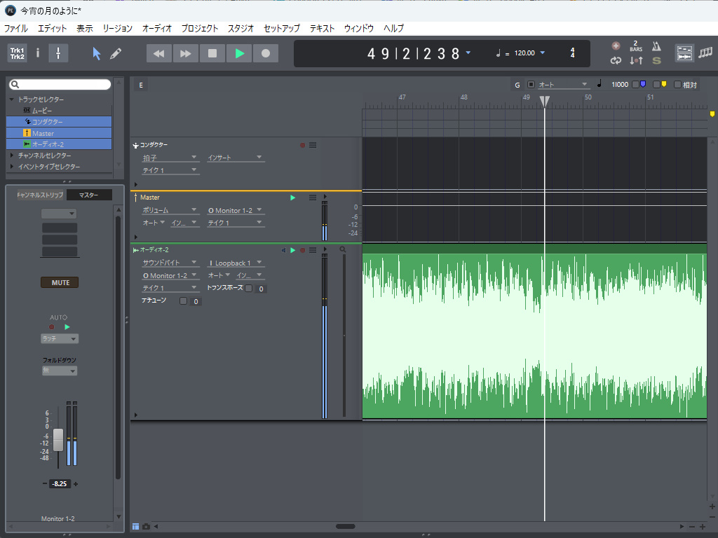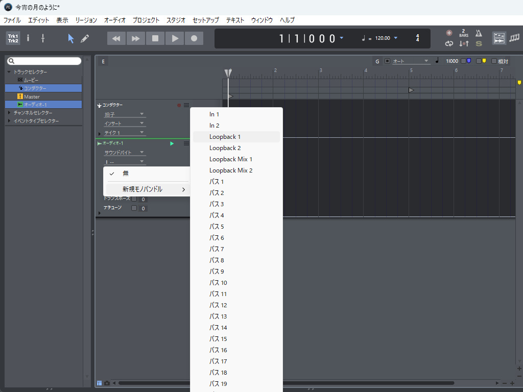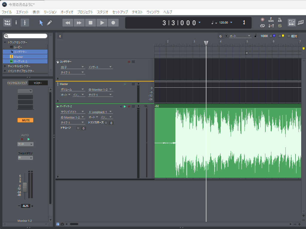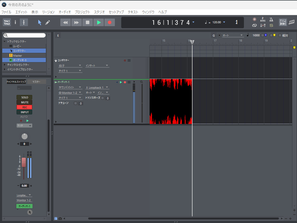 確認する為に「Master」と「チャンネルストリップ」のミュートが外れてる事を確認して、再生待機状態(緑の再生マーク)をオンにして、一番上の再生をクリック