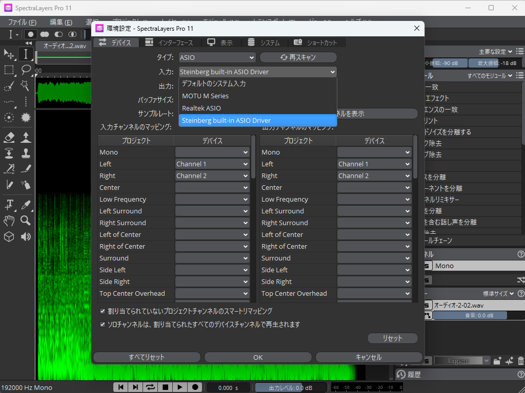 って思ってましたが全く音が出力(ヘッドフォンから聞こえない)されなかったのでSpectraLayersの販売元?の「Steinberg」のドライバを選択するといけました!!