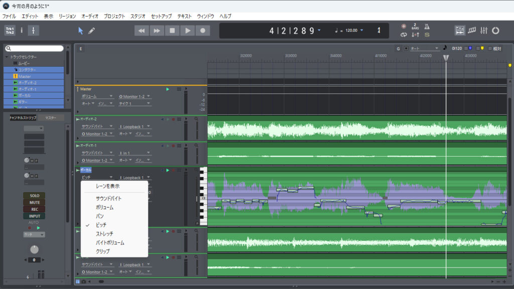トラック名の下、選択してる画像では「ボーカル」の下「ピッチ」と表示されてる下↓をクリックします。