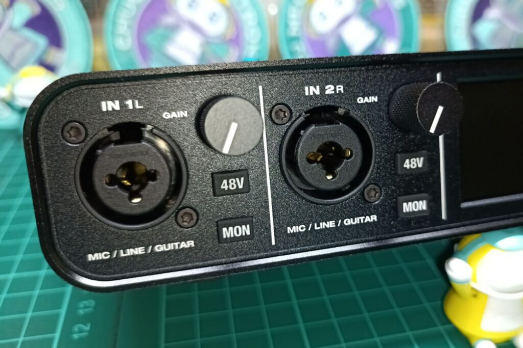 コンデンサーマイクを接続する際に必要なファンタム電源ボタンが有ります。