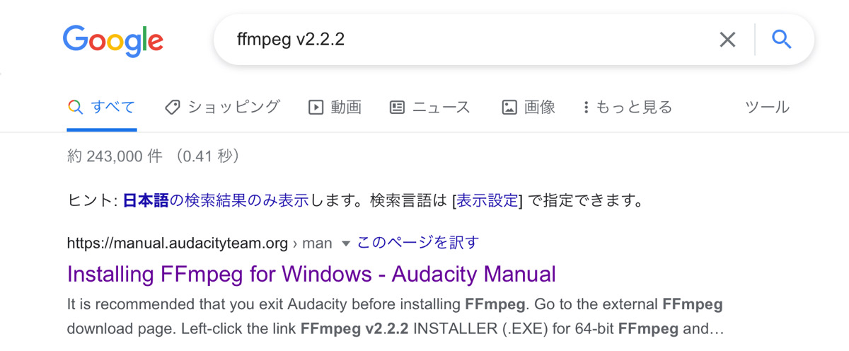 「ffmpeg」のダウンロードを行い、そのファイルを「Audacity」で取り込む。