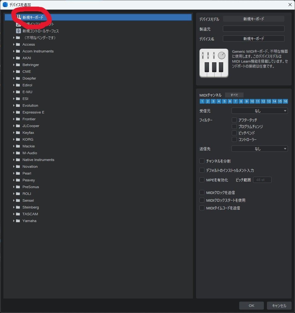 次はDAW側でMIDI機器の登録です。