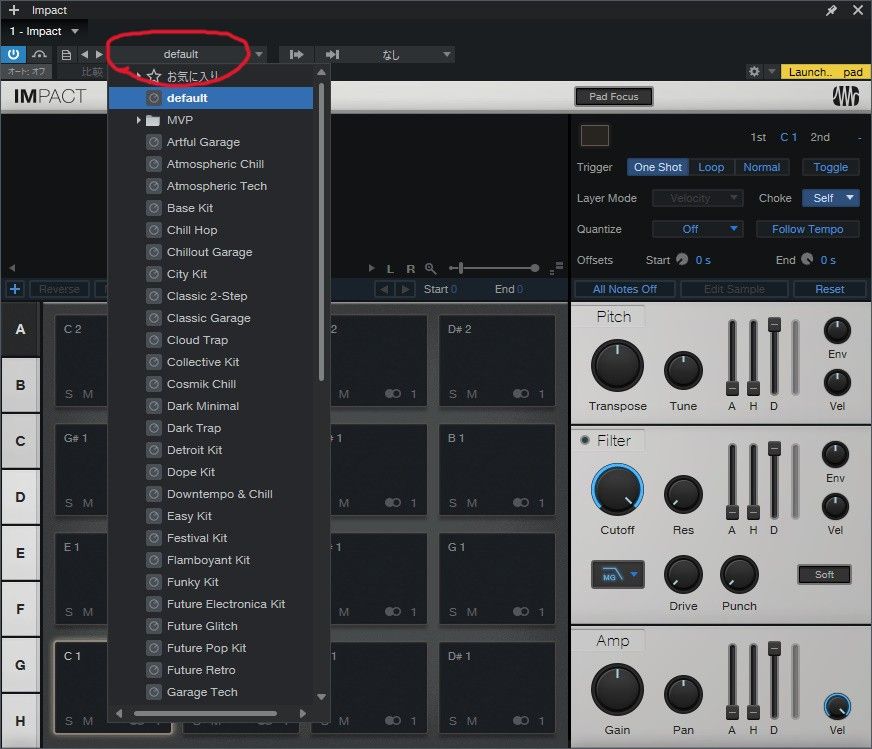 赤丸で囲ってる箇所をクリックすると登録されてるドラムの音色が色々と出てきます。