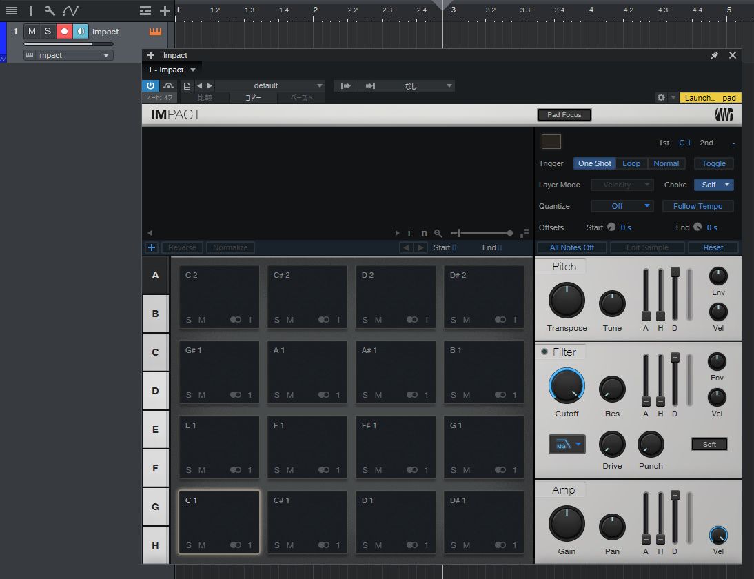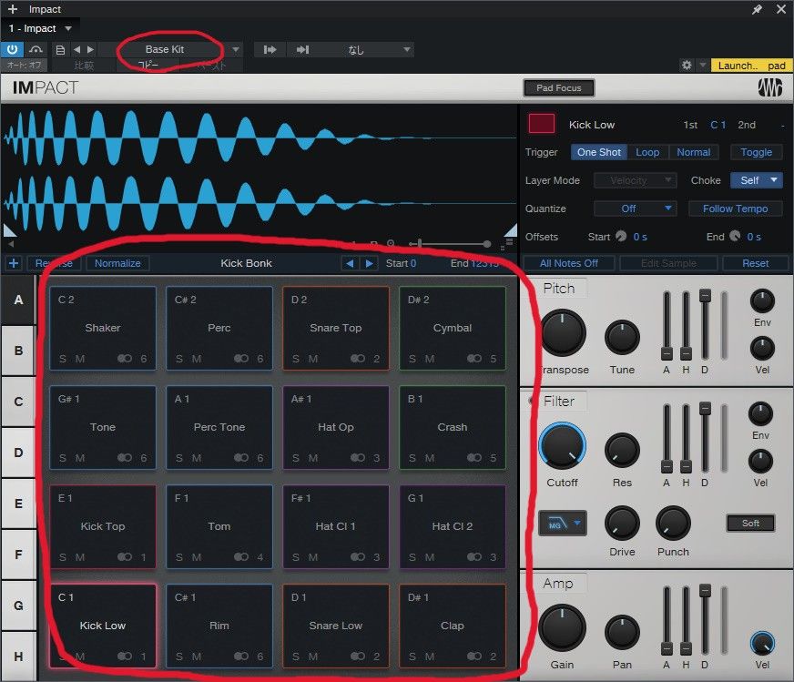 IMPACTの画面のパッドにドラムのどのパーツかの音が入りました。