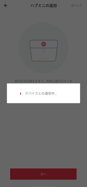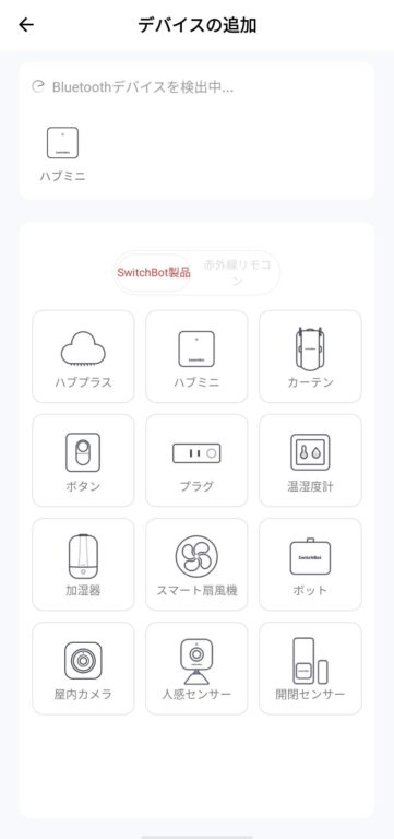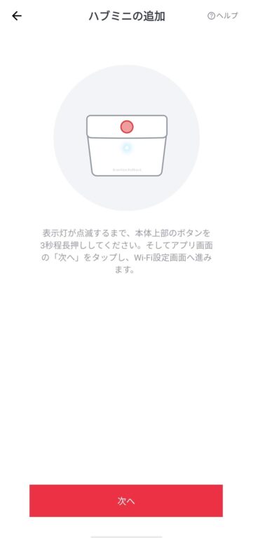 登録していないハブミニが検出されると、画面の通りになります。手順に沿って、本体のペアリングボタンを押して、登録します。