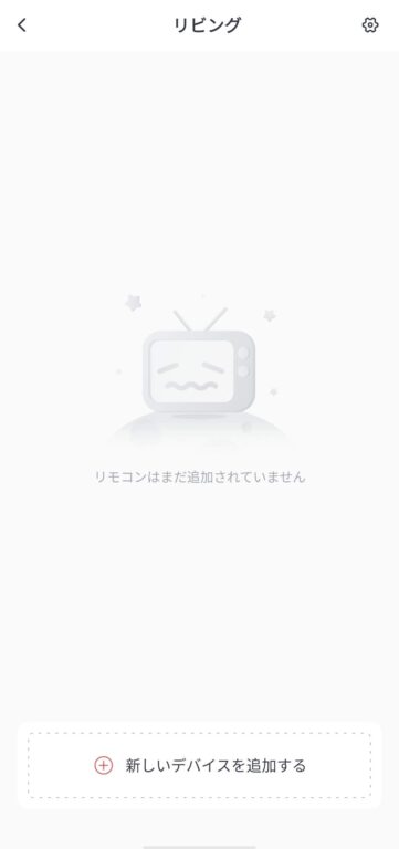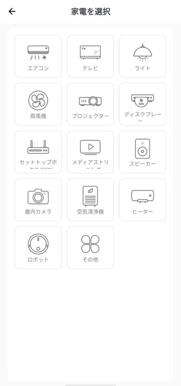 下の「新しいデバイスを追加する」をタップすると、「リビング」と名付けられたミニハブに、何のリモコンを登録するかの画面になります。