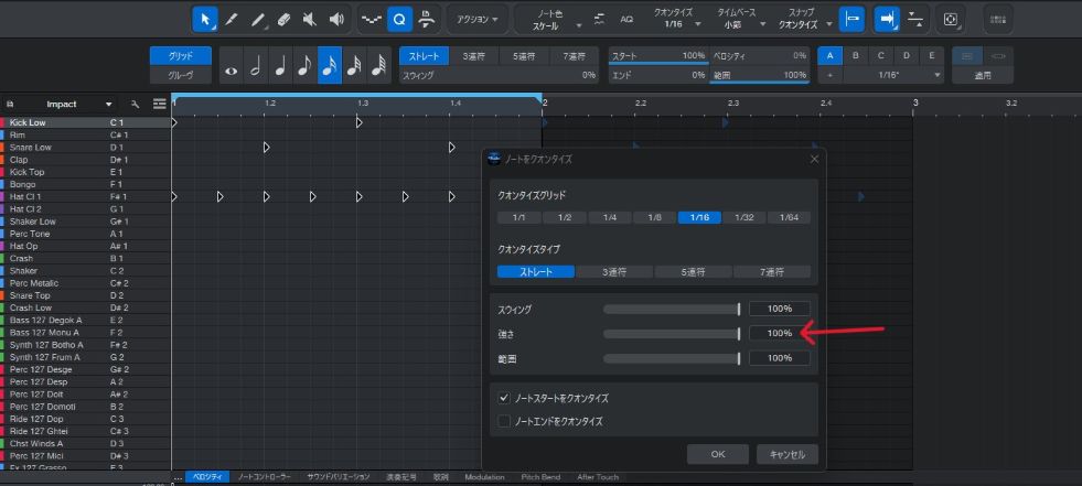だから、揃っている打ち込みにクオンタイズをかけました。